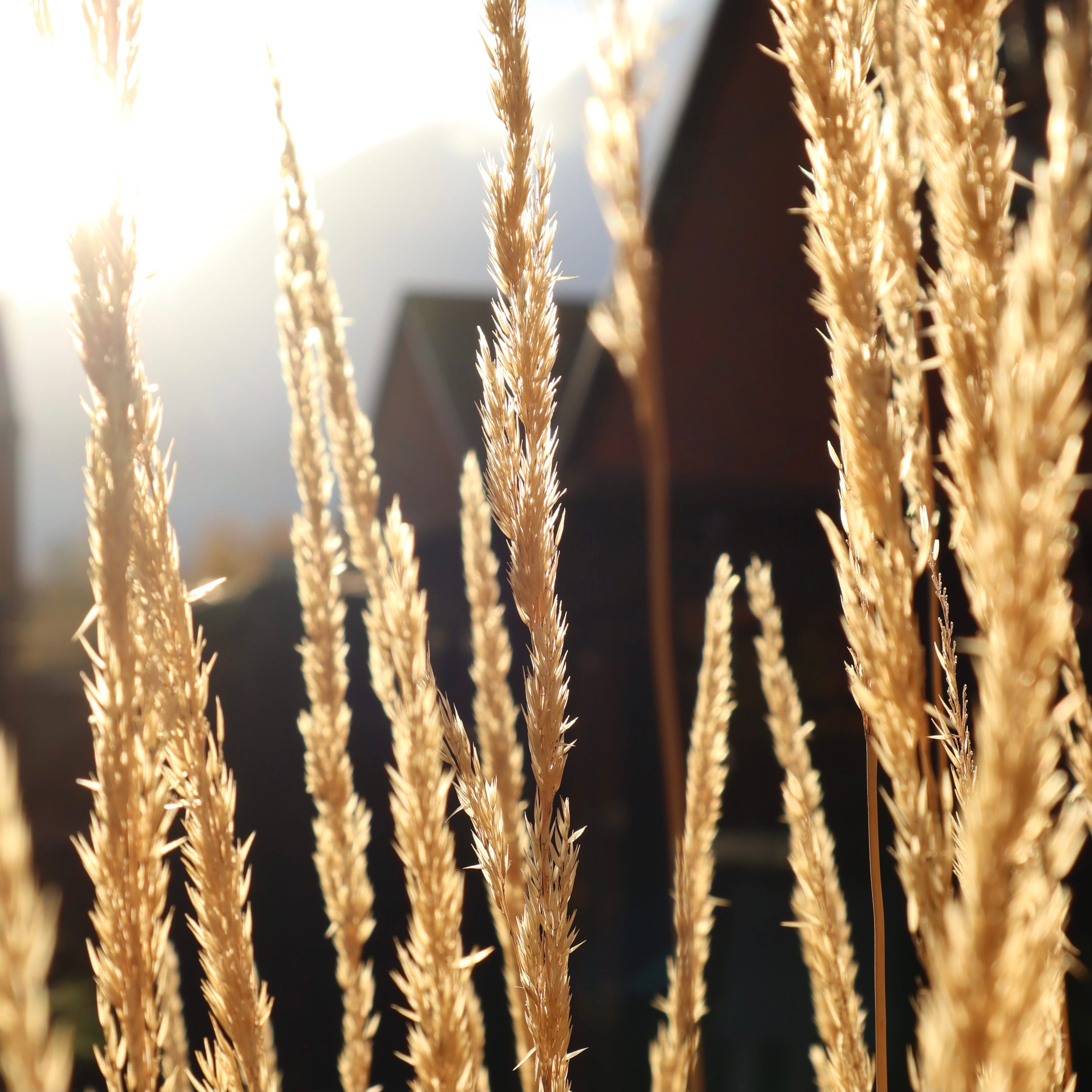 Bright blonde seed heads of Calamagrostis x acutiflora ‘Karl Foerster’ backlit by sunshine