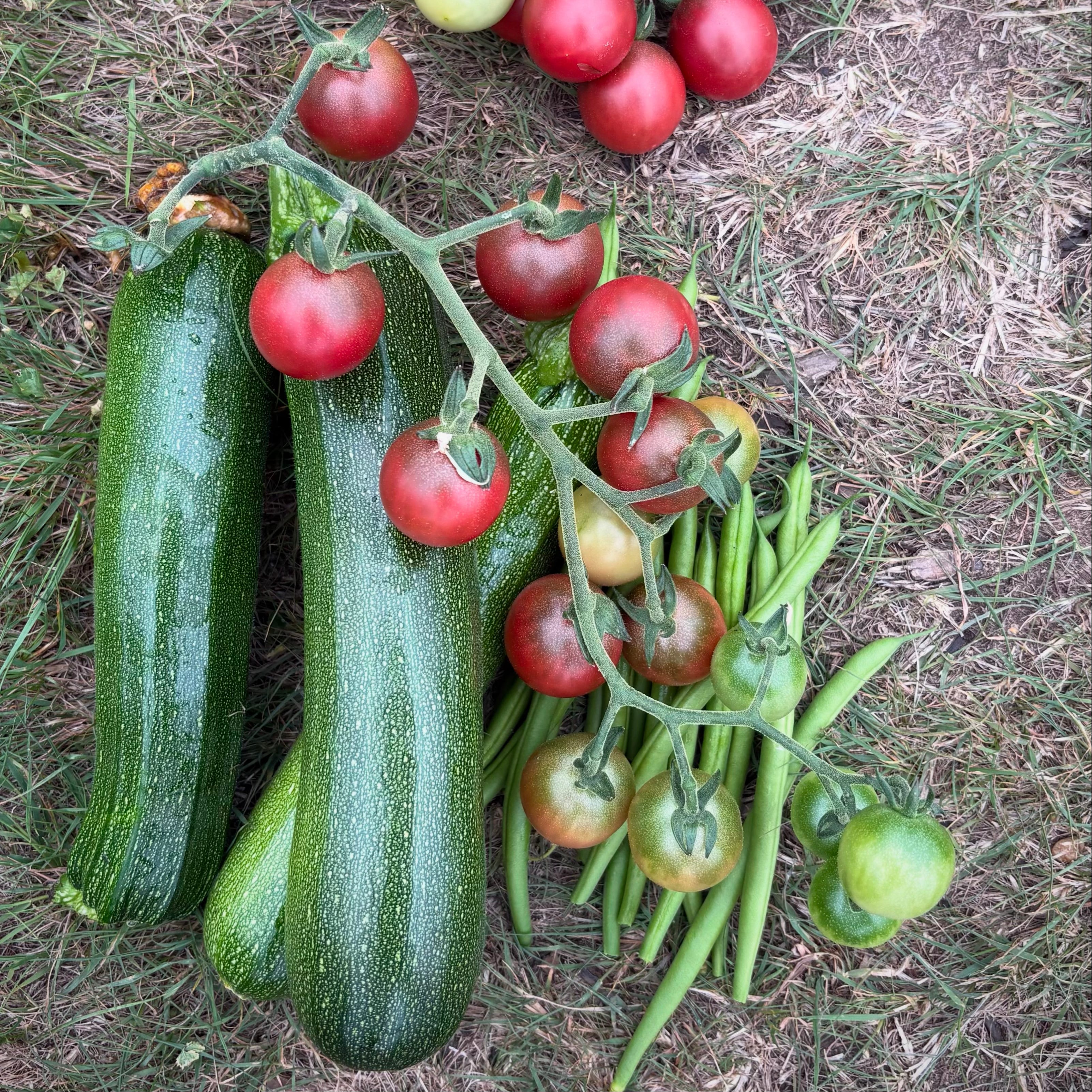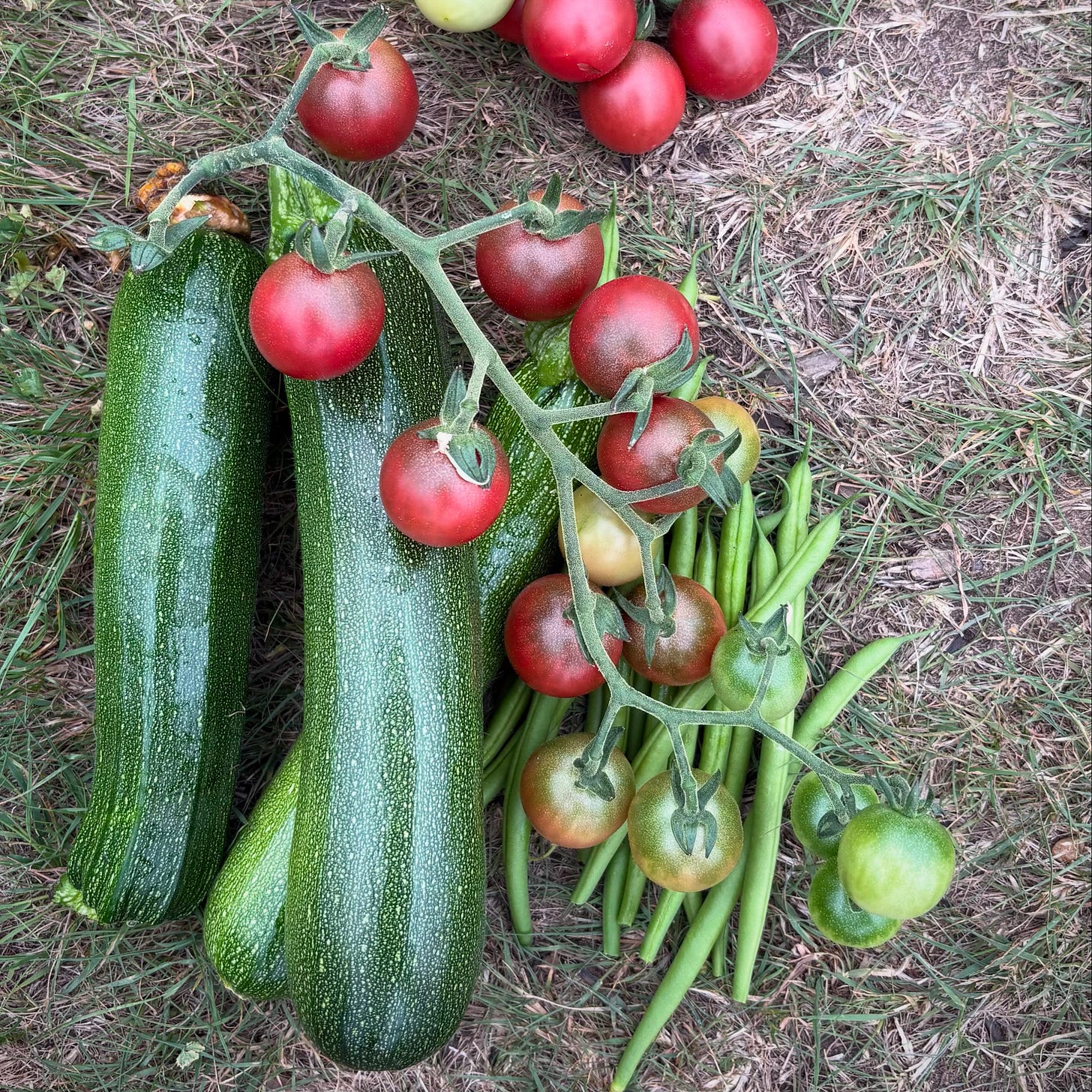 The first of the tomatoes cropped this season, plus some French beans and courgettes – to balance the chocolate consumption…