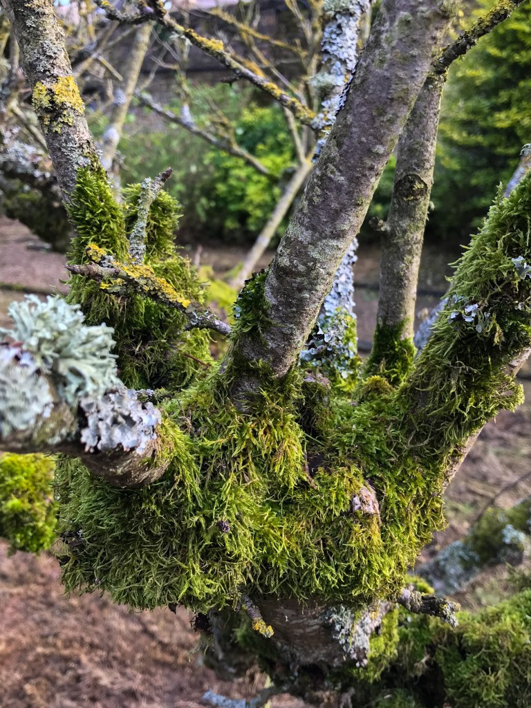 By coincidence I noticed a particularly attractive clump of moss on the apple tree today. Despite there being an absence of leaf or bud I was also drawn to the sculptural value of the tree. I felt the tree was now truly mature, which is poignant today as it is my son’s 37th birthday and the tree was a gift to mark his birth.