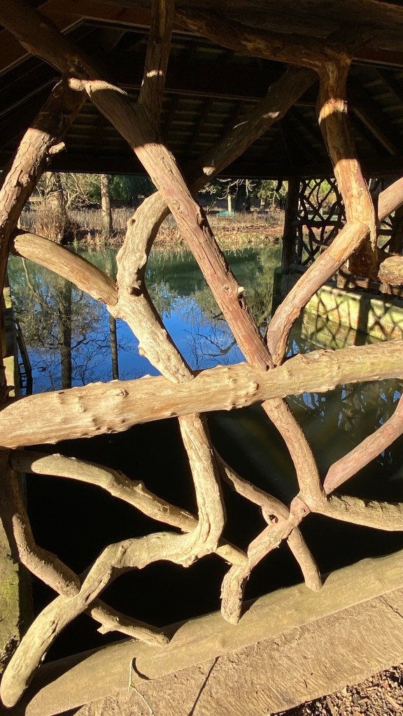 My gaze became held by the river surface patterned with leaves and reflected sky, the crazy stick work of the boathouse repeated itself in crisp perfection. Inverted, towering plane trees reached down to a parallel landscape, holding a mirrored sun firmly between plane mottled branches. This long natural river scene though, with its stone arches and composed cascades, with its lofty trees and view framed by outgrown evergreen yew clumps – was a complete fabrication.