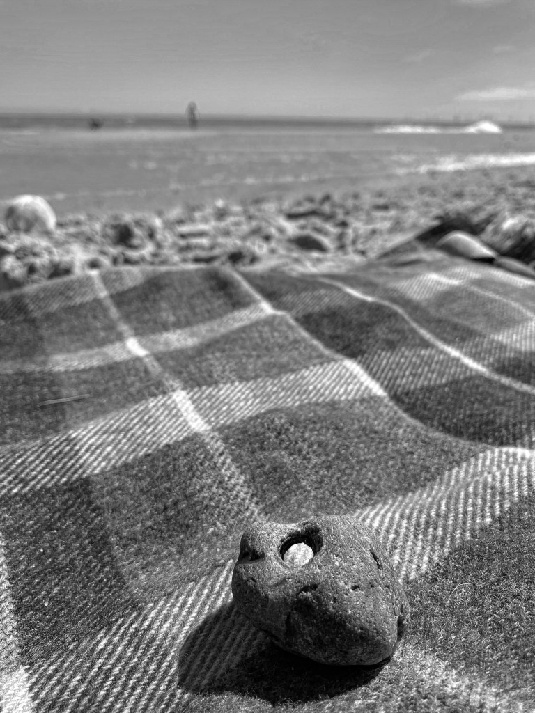 Breaking my thought line I lean out from the blanket and scan the beach stones nearby, scooping up one that catches my eye. It’s about the weight of but a little bigger than a golf ball, dark grey in colour and tumble-smoothed by the sea. At one end, thanks to a narrow hole I can even look right through to the sky. A hagstone! I think to myself, I’ve actually found one, or maybe this hagstone has found me. Whatever is true, as I sit here studying and exploring the stone’s form, my connection to its spirit and this place grows stronger.