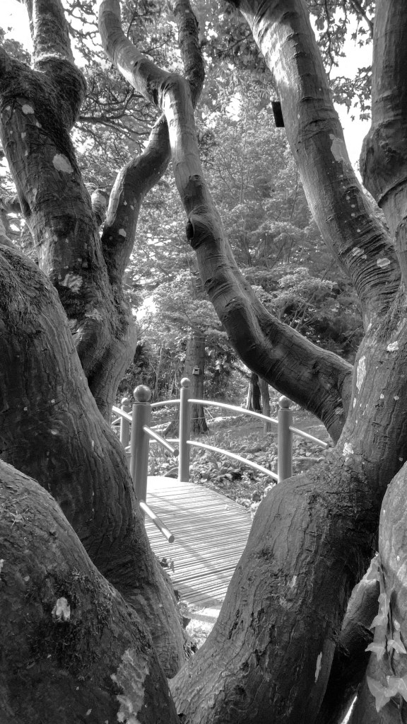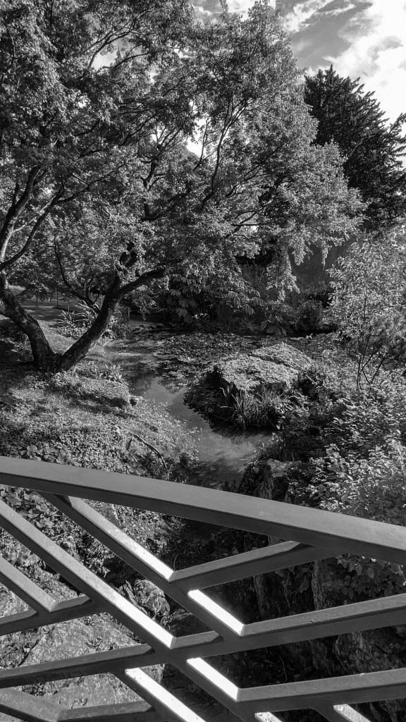 Into my view and just across the way came a large lily pond cushioned to the rear by a belt of ferns, their fronds showing signs of a seasonal shift. Filtered light fell all over this area as my still busy mind processed all I could take in. I wondered whether, by the end of October, if the ferns would light up due to the cold or whether they’d fade away gently, as some do, to a brown crispy nothingness.