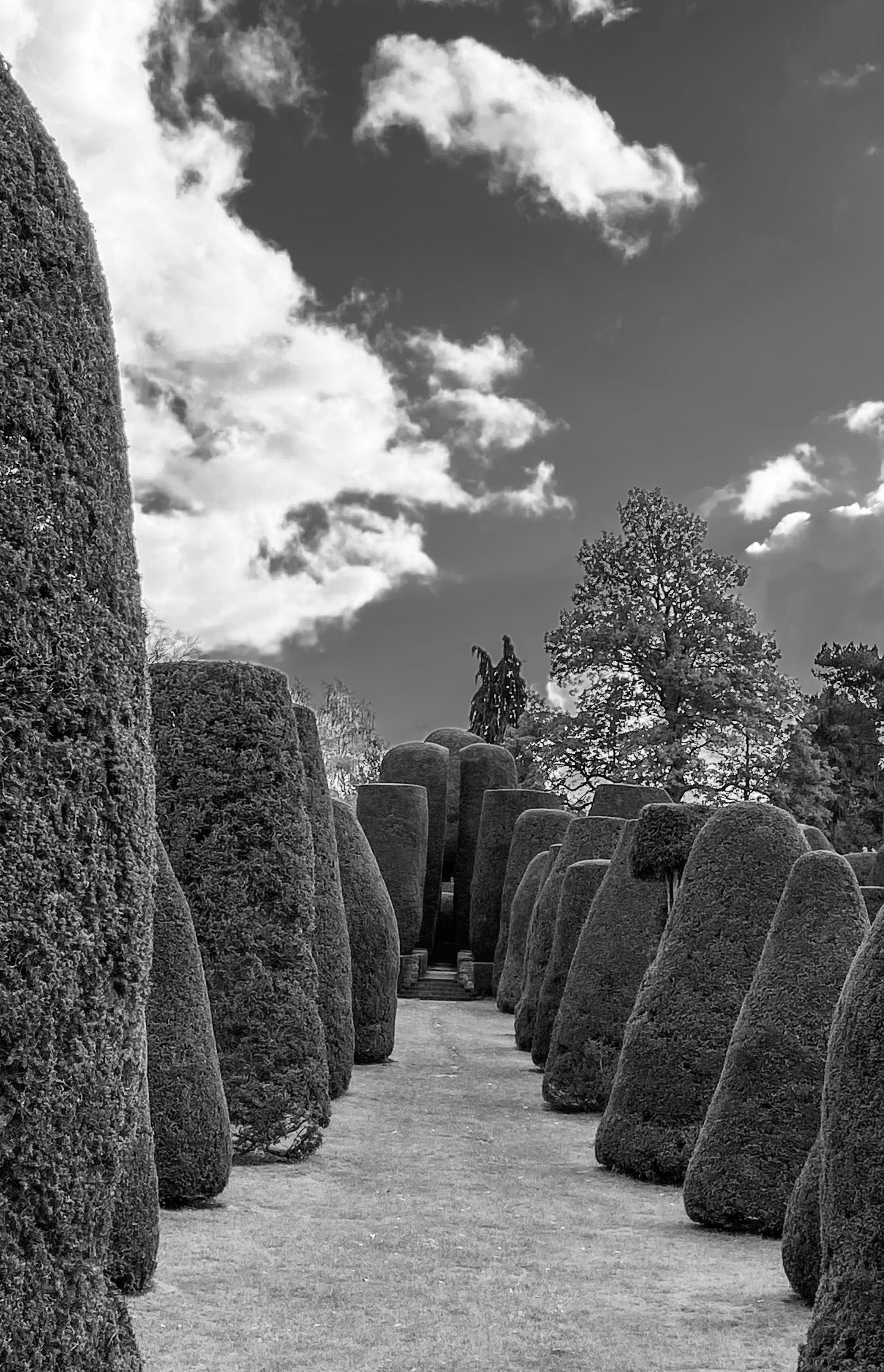 Not last and never the least is a large rectangular topiary garden, a time travelling evergreen relic equalled in character by precious few places across the land. Enclosed by long cloud-like hedges of box along each stretched side, its entrance features a raised brick walkway that holds bee-bole clues to this garden’s fruitier former self. To the other end yet another terrace rises, this time hedged and grassed and leading through a gate to a path that spirals up a viewing mount, to a seat beneath a master yew. This part of the place with its clipped wavy hedges, close shaven lawn and topiary trees, is an incredibly soothing place to spend time, and worthy of visiting itself.