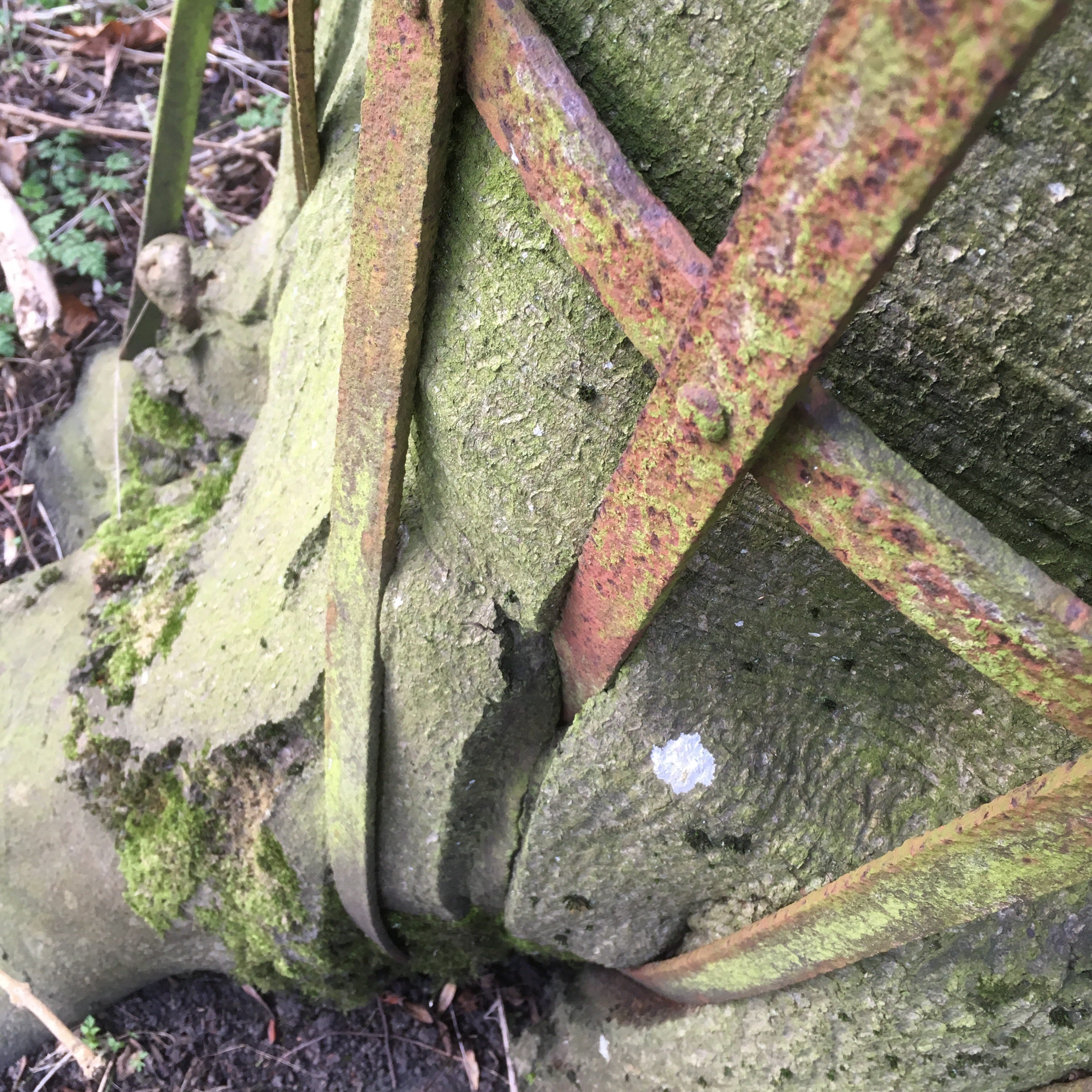 Our tree with a stout trunk of around four metres, sports a relatively well-formed crown given its constrictive circumstances. Its lower limbs, having succumbed to shade forced upon it by neighbourly planting have been lost, and now lie crumbling where they fell on the woodland floor. All remaining limbs by comparison stretch upward at sharp angles, reaching for the light and trying to elbow aside any pretenders to the throne – none of which really have the strength to seriously challenge our beech just yet. This tree, a wounded survivor with lichen patched bark and rusted ironwork shackles blends effortlessly with its surroundings, as if it was meant to be.