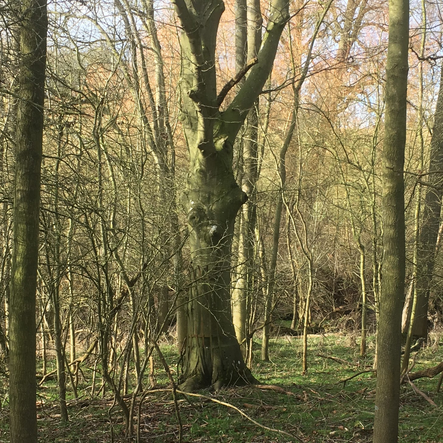 Whilst our tree might have arrived with the best of intentions, its fate seems to have been sealed with a change in the wind. At some stage a new fence was added to the hillside just a few decades ago, sealing our tree into a new parcel of woodland and transforming it from a fine parkland specimen to another tree in the woods. Indeed, it seems hard to fathom how the woodland planters at the time could have turned a blind eye to the metal rings around our beech, when back then they could more easily have been removed.