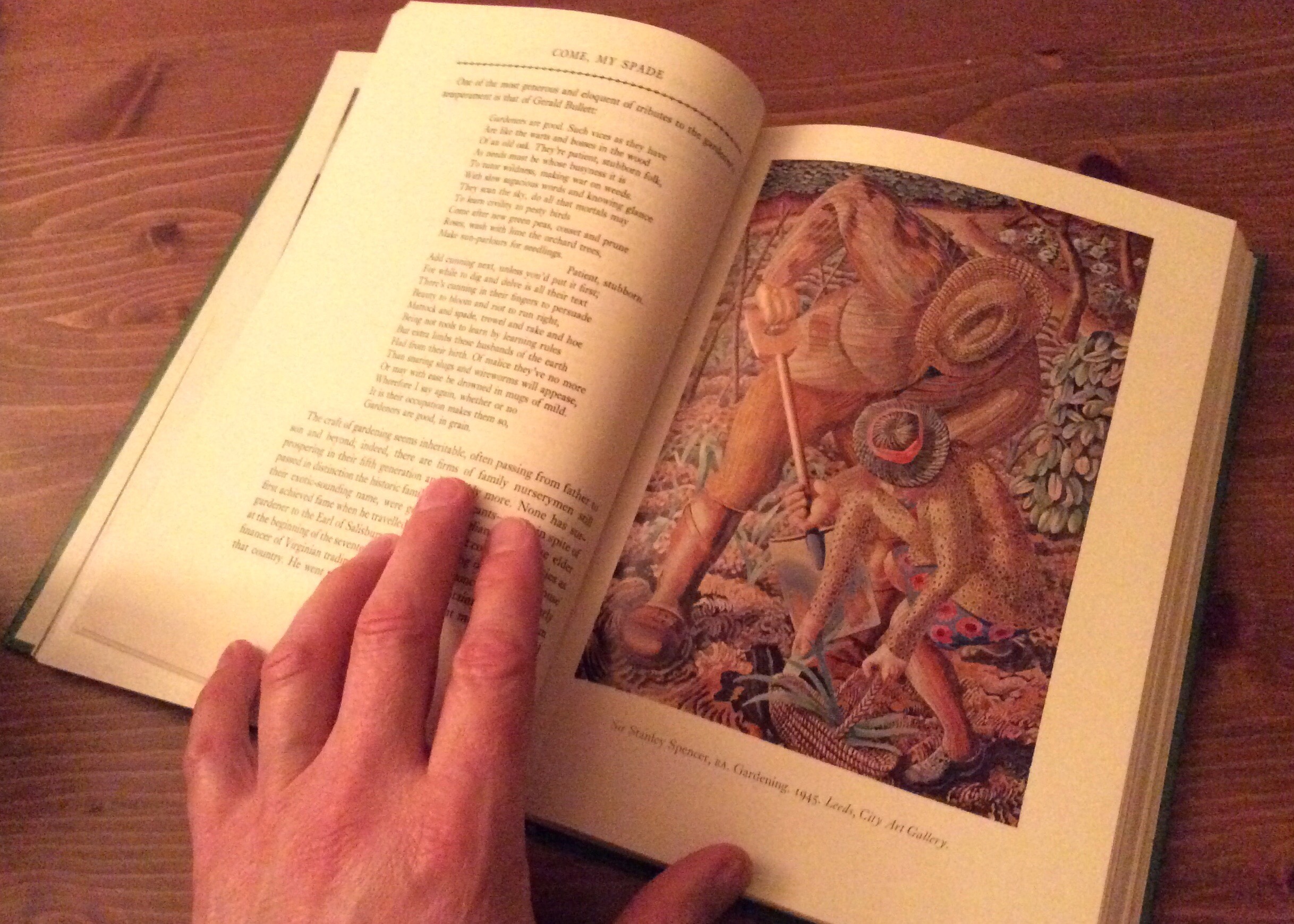 During a sort through my gardening books recently, I couldn’t help but open up a few covers and thumb through a few pages, as you do…. Naturally, a few historic maps and illustrations caught my eye, including the Stanley Spencer image shown below. Whilst pouring over the image though, I couldn’t help but take in a few well chosen words on its opposing page – it would have been rude not to…