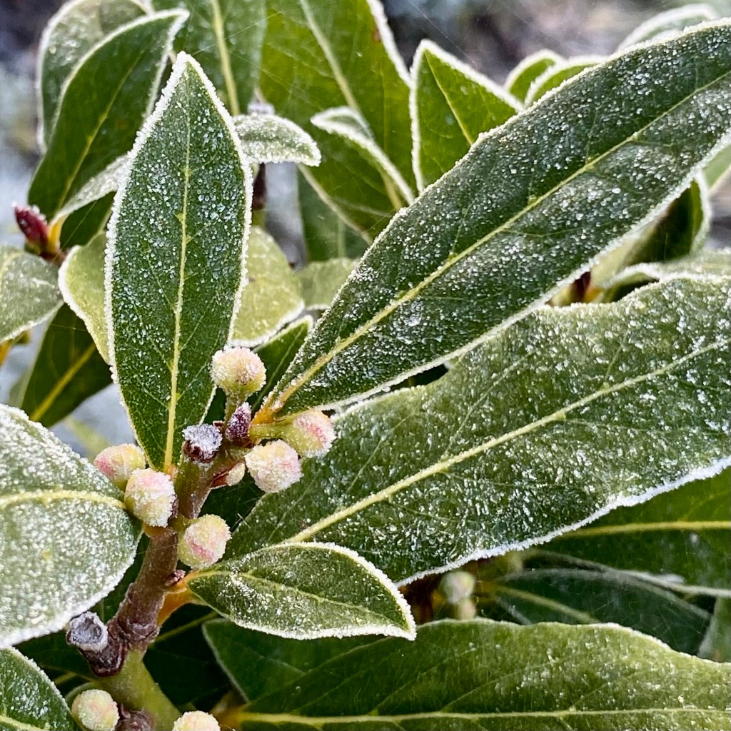 Whatever the weather, and whatever the cause, this morning’s rushed road trip turned out to have a silvery lining after all. For one, it put me out amongst that village view, even if it were in a toasty car, and for two, it pushed me to consider more carefully the sugared fields and frozen hedgerows, the tufty roadside grass and even an obelisk’s bay leaves beside my parking space at home, which were frosted perfectly around their margins. Indeed, I was conjuring up words even before I sat down to write.