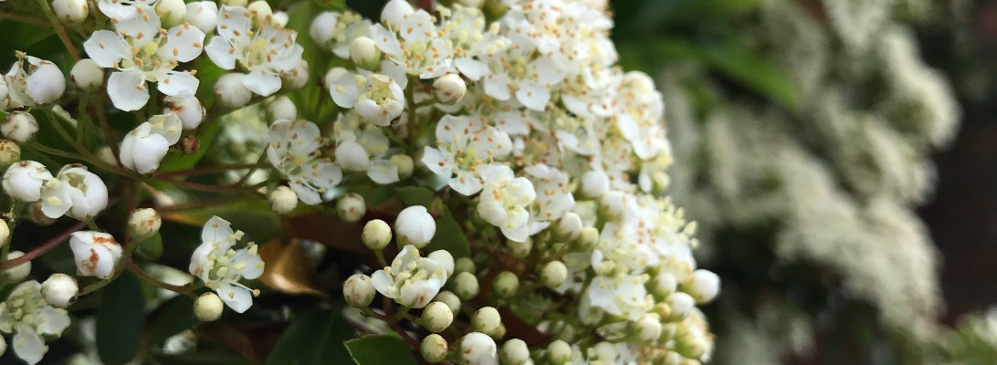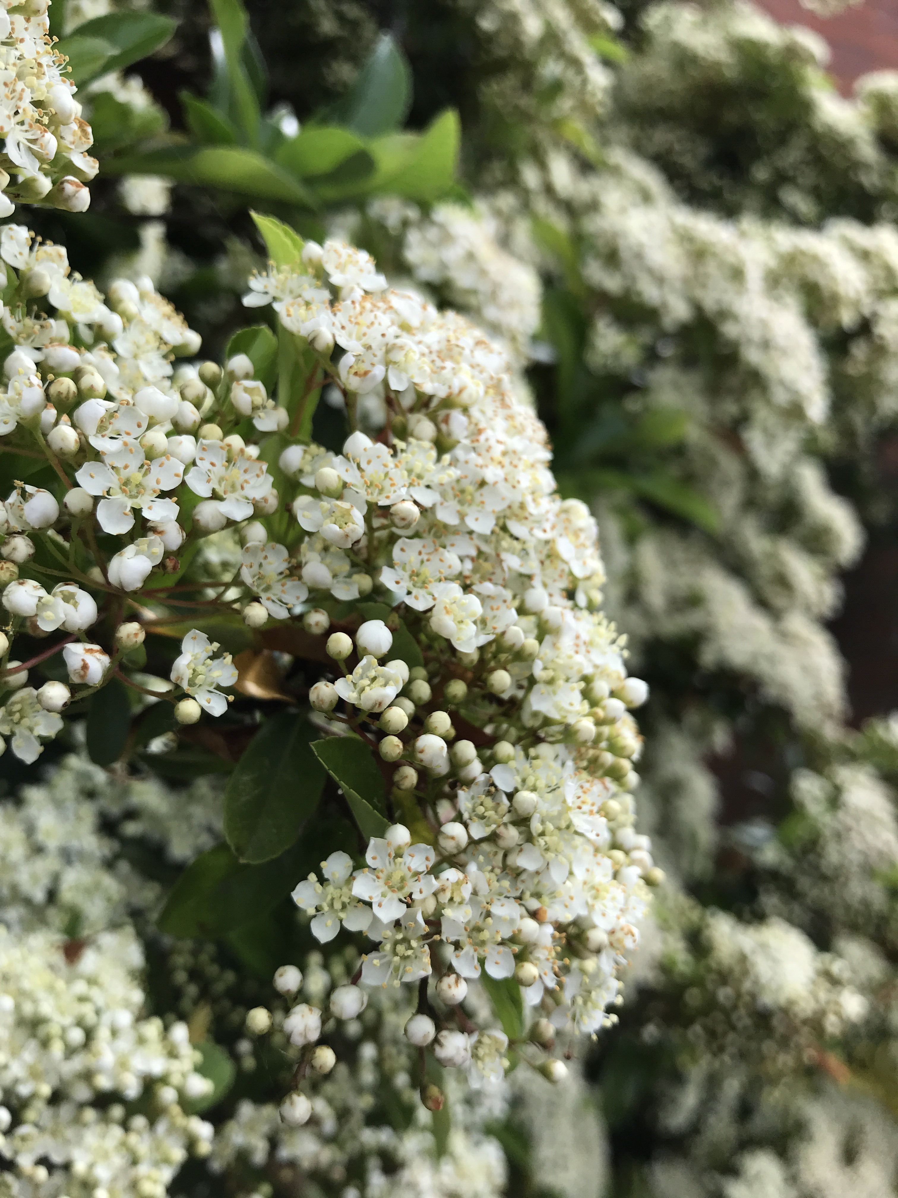 A curving rear wall supports a Pyracantha, which to my mind has been neatly trained over many years. It is just now reaching its first annual climax as it begins to burst its many champagne coloured flower clusters. I particularly like the informal holes where birds fly in to go bug hunting.