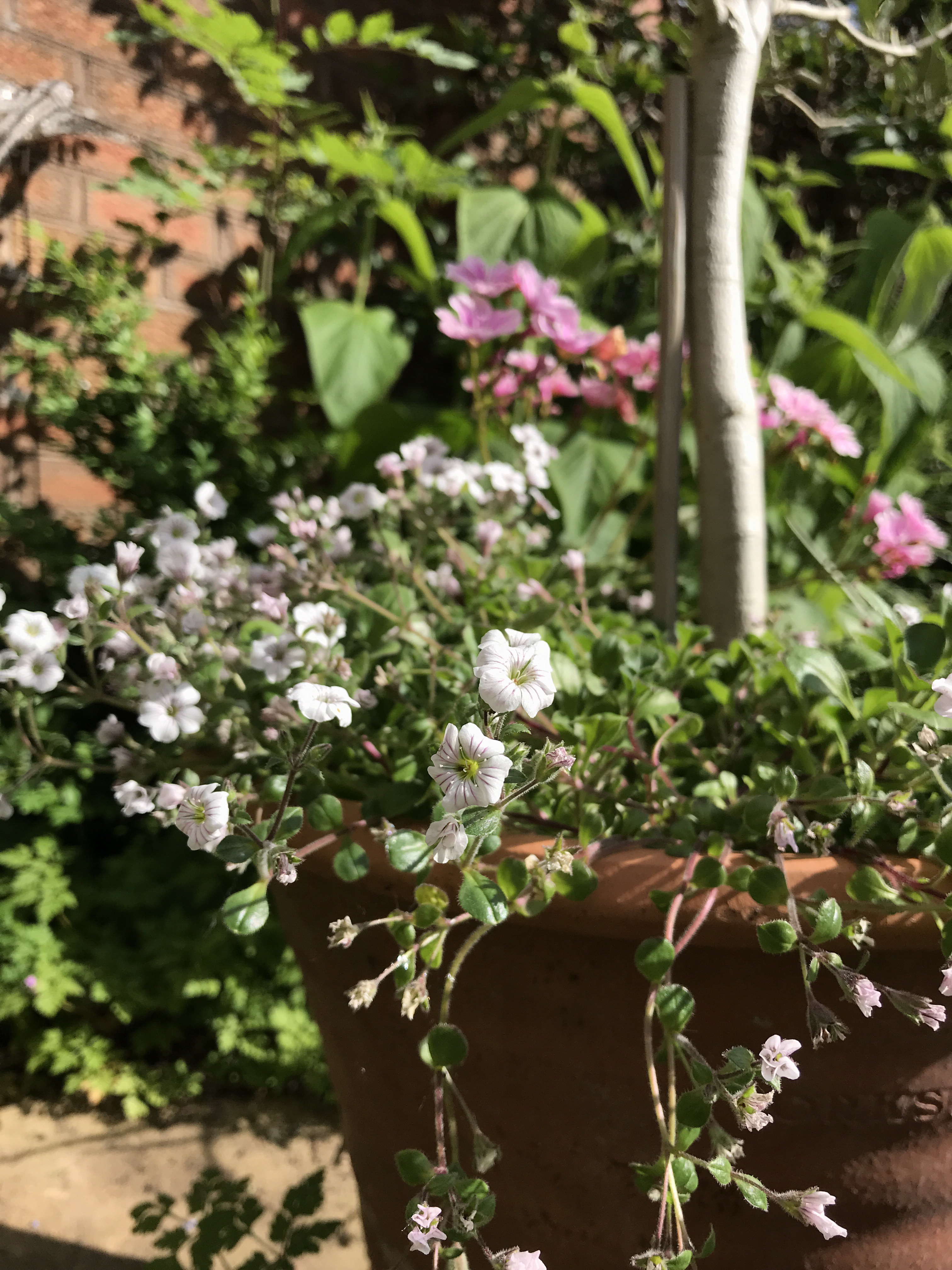 A cascading Gypsophila overflows its pot whilst flowering freely with dozens of tiny white trumpets, all worshiping the light, while from its Lewisia neighbour rise numerous slender stalks bearing exquisite pink blushed floral disks.