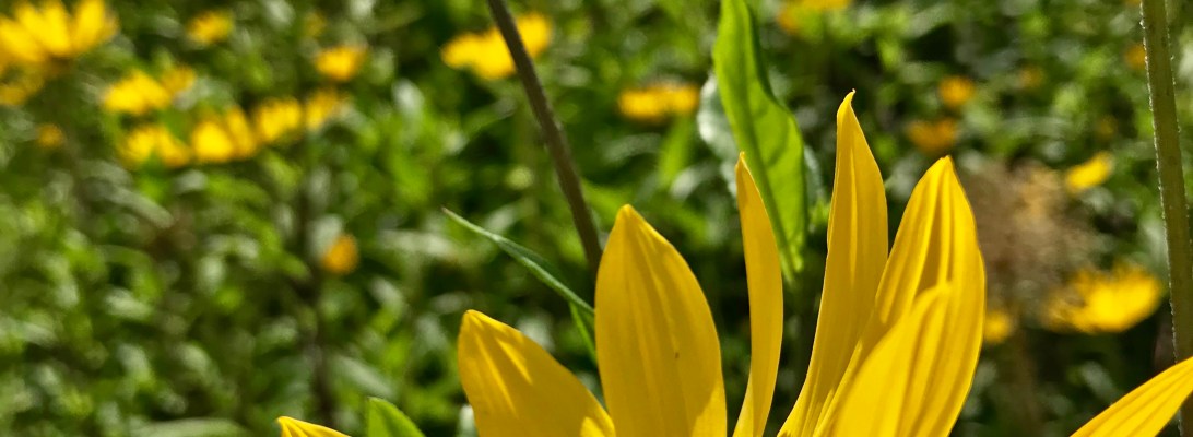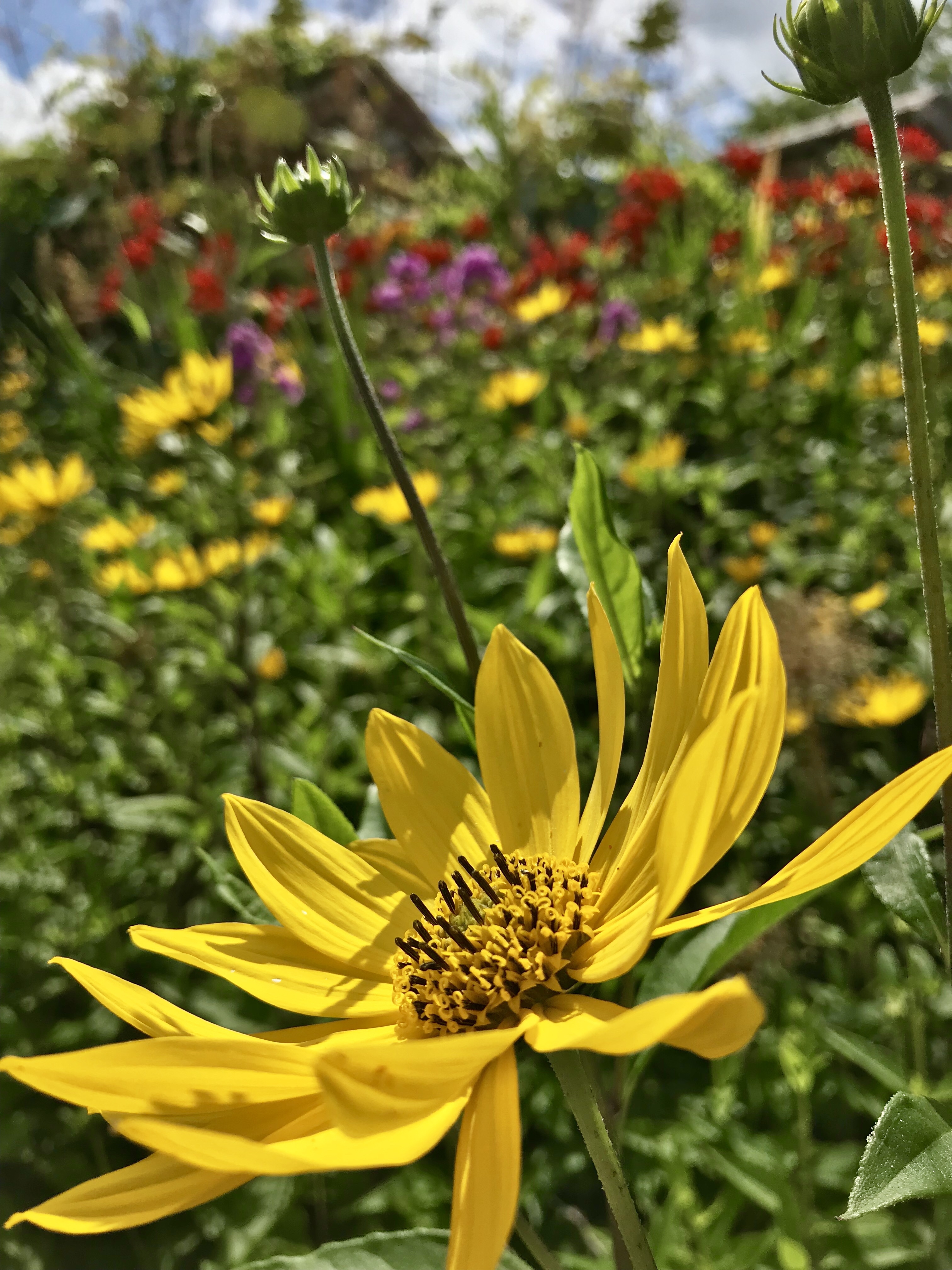 at least a dozen different plants in flower, (not including the lawn daisies!) with